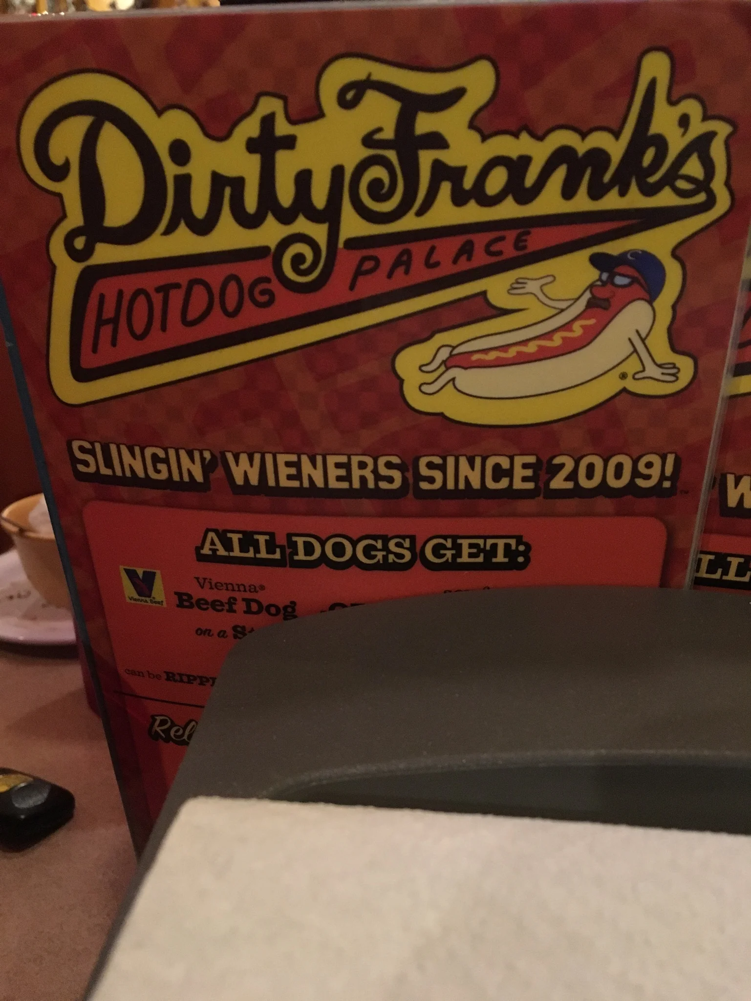A and A suggest we go to Dirty Frank’s for gourmet hot dogs, so we do. On the way over I sing crazy parody lyrics to Dirty Projectors and Aaron LIKES it. Dirty Franks’ logo is a hot dog with sunglasses and a baseball cap and a big mustache. Looks totally like Kenny Dennis.